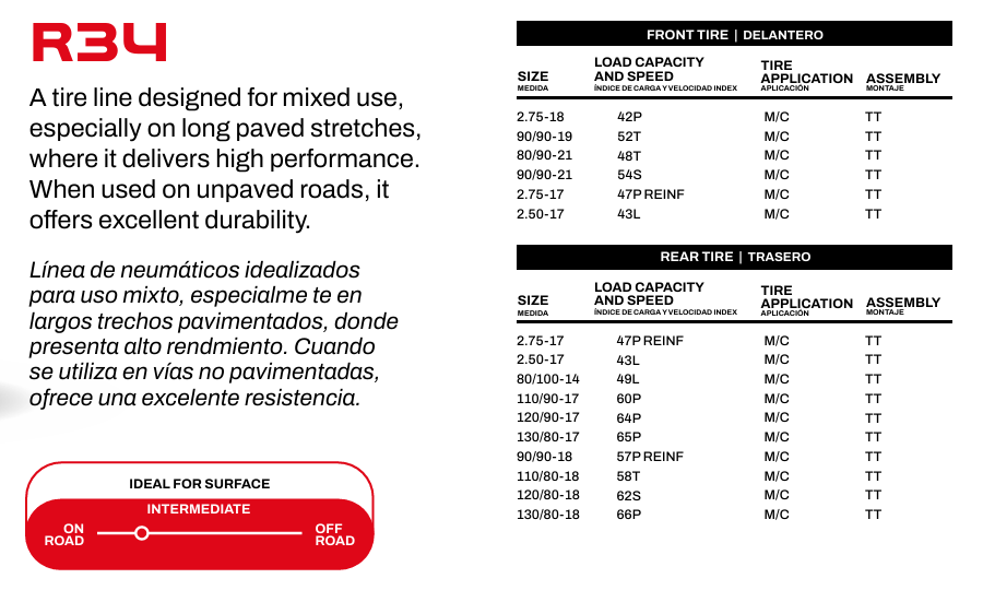 Buena relación costo-beneficio: considerando su versatilidad, durabilidad y nivel de desempeño, la R34 es una opción competitiva frente a otros neumáticos de gama similar — ideal para quien busca equilibrio entre calidad y precio.