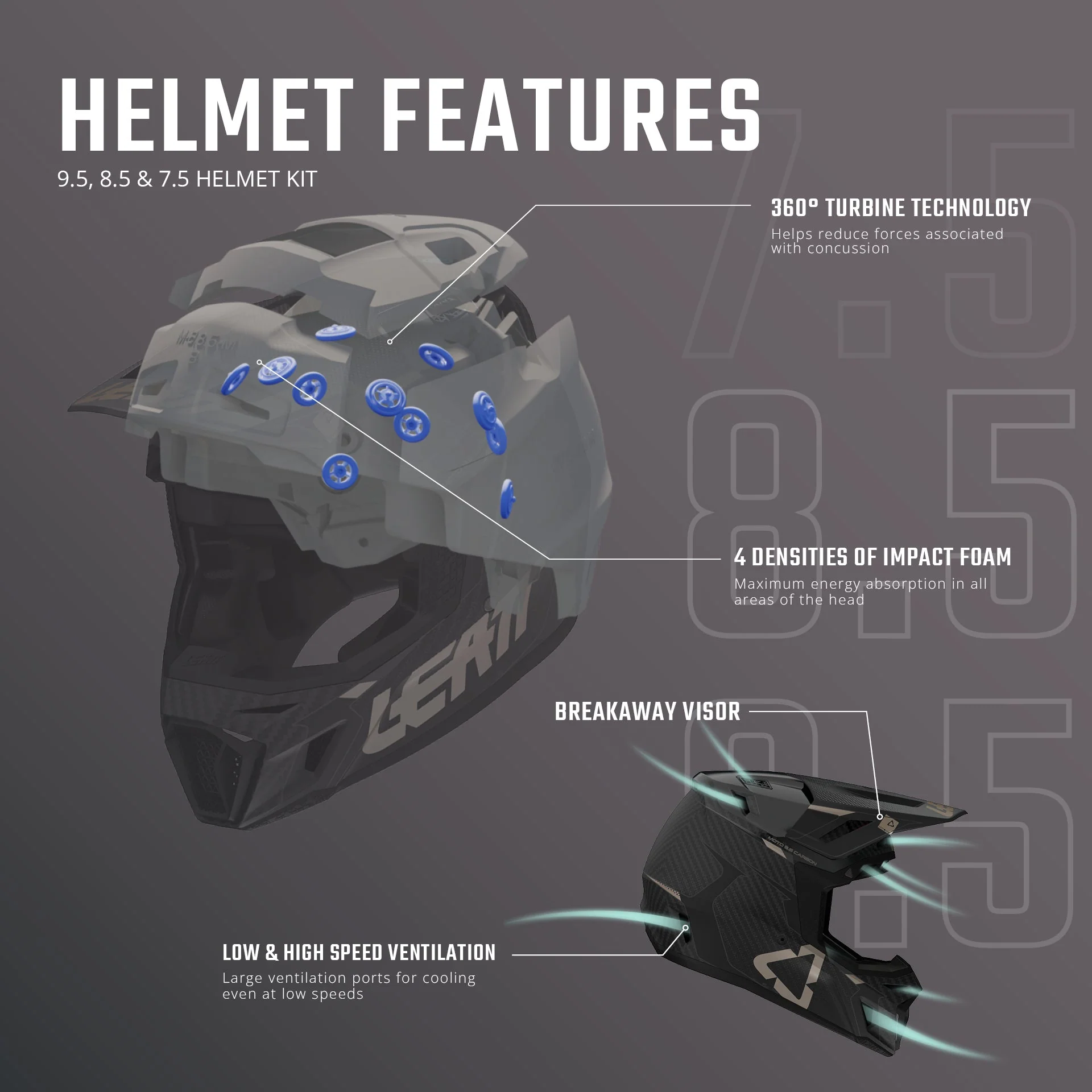 El kit de casco Moto 9.5 está diseñado para pilotos que lo exigen todo: rendimiento de élite, comodidad ultraligera y protección de vanguardia. El casco Moto 9.5 cuenta con una carcasa de carbono ligera sin sacrificar la resistencia, reforzada con espuma de impacto multidensidad y la tecnología Leatt 360° Turbine para proteger contra impactos lineales y rotacionales.